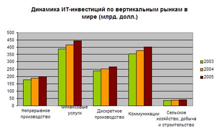 Динамика роста ИТ-инвестиций по вертикальным рынкам в мире за 2003–2004 гг. соответствует тенденции, намеченной на перспективу до 2006 года: производство увеличивает свои затраты на ИТ с меньшей активностью, чем сектор финансовых услуг или телекоммуникаций. Этот феномен можно отчасти объяснить тем, что в отрасли уже достигнута некоторая точка ИТ-насыщения. Как известно, именно в промышленности в первую очередь начинали внедрять системы автоматизации класса MRP и затем ERP. С одной стороны, внедрив «тяжелое» решение, предприятие не будет менять систему, как минимум, ближайшие лет 10 (эксперты утверждают, что срок плановой замены подобных продуктов наступает примерно через 15 лет). С другой стороны, оно все равно продолжит вкладывать средства в его поддержку — поэтому уровень затрат на ИТ здесь в итоге остается достаточно высоким.
