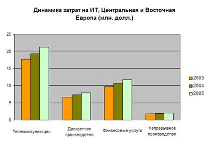 В 2003–2004 гг. самый значительный рост ИТ-затрат в регионе Центральной и Восточной Европы также отмечается в телекоммуникационном секторе. Наименее активно инвестирует в высокие технологии непрерывное производство, практически не увеличивая уровень своих ИТ-затрат в эти 2 года.