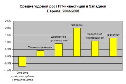 В странах Западной Европы среднегодовые темпы роста ИТ-инвестиций по всем вертикальным рынкам в перспективе до 2008 гг. значительно уступят показателям восточного европейского региона. Во «флагманском» — финансовом секторе они составят всего 2%, в процессном производстве вырастут на 1,1%, в дискретном — на 0,9%. Со своей стороны, строительные и добывающие предприятия Западной Европы вообще сократят своей потребление ИТ на 0,7%.