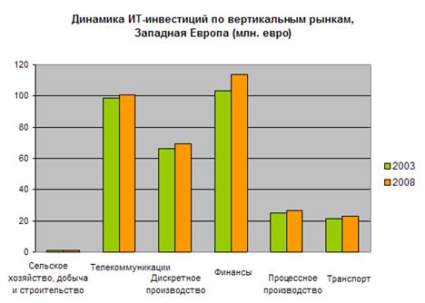 К 2008 году в Западной Европе наиболее всего увеличит свои ИТ-инвестиции финансовый сектор, с показателя в 103 до 113 млн. евро. Уровень потребления ИТ в процессном производстве вырастет незначительно — с 25 до 26 млн. евро, в дискретном производстве — с 66 до 69 млн. евро.