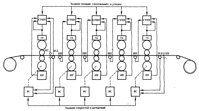 Комплекс подобных систем включает взаимосвязано и согласованно действующие: грубый регулятор, воздействующий на толщину полосы в первой клети через нажимное устройство функции отклонения толщины за первой клетью; тонкий регулятор, компенсирующий изменения натяжения, ошибки толщины; систему регулирования натяжений, воздействующую через нажимные устройства клетей. Фактически отработка управляющих сигналов тонкого регулятора осуществляется через систему регулирования натяжений.