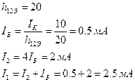 Статический коэффициент передачи тока биполярного транзистора в схеме с общим эмиттером выбирается близким к наименьшему значению или приравнивается к нему самому. С помощью и уже известного значения тока на коллекторе находится ток базы. Ток, проходящий через сопротивление , берётся в четыре раза больше. Отсюда по первому закону Кирхгофа находится ток на резисторе .