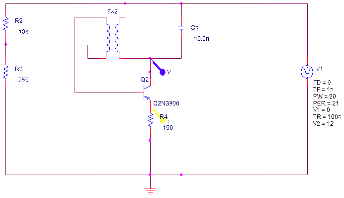 В соответствии с заданием разработан LC-генератор с обратной связью на транзисторе КТ315Г. Форма колебаний напряжений синусоидальна, среднее значение напряжения на коллекторе составляет 12 В при входном напряжении 12 В, его амплитуда равна 15 В. Рабочая частота соответствует требованиям условия задания и равна 250 кГц.