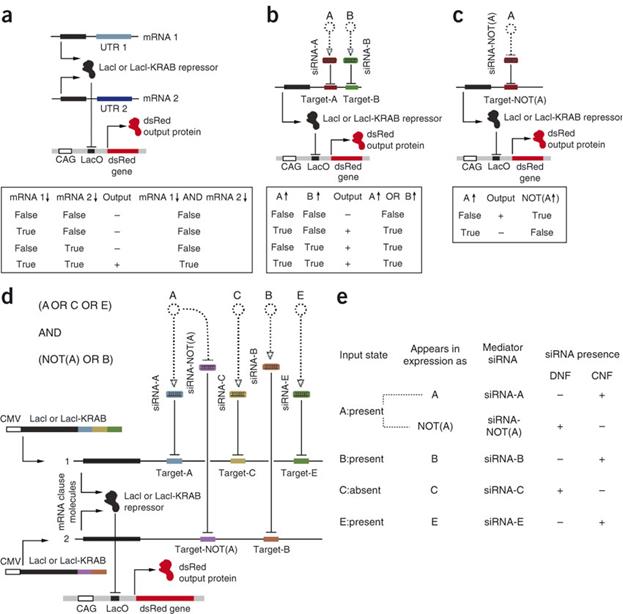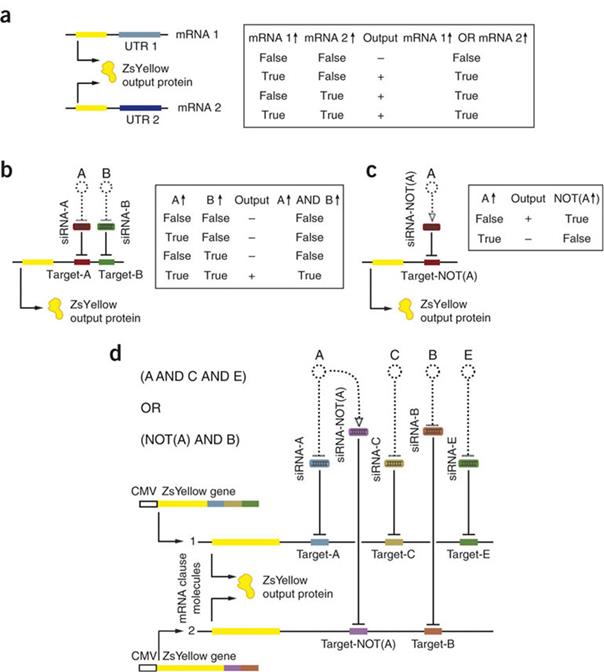 To construct an evaluator that embodies the first approach, we build a biological 'circuit' that comprises two or more mRNA species that encode the same protein, but have different noncoding regions. This protein is the system's output; a biologically active output may function as an actuator. If at least one mRNA species is translated, the resulting output will represent a logic True value, implementing an OR operation10, 12 (Fig. 1a). The levels of mRNA species and the output are determined by the presence or absence of the endogenous molecular inputs with the help of molecular mediators. siRNA molecules target untranslated regions and hence are natural candidates for such mediation. First, we fuse different sets of siRNA targets into the 3'-untranslated regions (UTR) of the mRNAs, rendering them susceptible to either of these siRNAs25. Next, we establish selective inhibitory links between endogenous inputs and these siRNAs. All inputs must be present at the same time to block all siRNAs and generate output from an mRNA, corresponding to a logic AND operation (Fig. 1b). Furthermore, if, for example, inputs A and B block siRNAs that target one mRNA and inputs X and Y block siRNAs that target another, the circuit will generate an output when both A and B are present or when both X and Y are present. This comprises the logic expression (A AND B) OR (X AND Y). If an activating link is established instead, the presence or absence of an input will block or enable output production from the mRNA, respectively. In logical terms, this amounts to a negation of the input 'truth value' (Fig. 1c). In the above example, input B activating its mediator siRNA turns the expression into (A AND NOT(B)) OR (X AND Y). The same input may block one siRNA and activate another, and thus appear in the expression both as itself and as its negation. This arrangement of input variables and their negations, known as literals, is called a disjunctive normal form (DNF) (Fig. 1d and Supplementary Fig. 1 online). Literals grouped by the AND operation are called 'clauses' and we call the mRNA species modified in their 3'-UTR, as well as the genes that express them, 'clause molecules'.