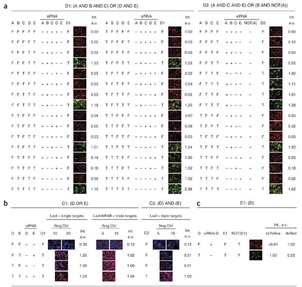 а – результаты оценки двух DNF-выражений, полученные для всех комбинаций переменных. Когда на входе siRNA имеют значения «–» (т.е. отсутствуют), то для одинакового общего количества siRNA во всех экспериментах в качестве негативного контроля использовали соответствующее количество нонсенсной siRNA (не имеющей здесь мишени). Цифры справа показывают суммарную интенсивность флуоресценции белка Zsyellow (зеленого цвета), отнесенную к интенсивности флуоресценции контрольного белка pAmCyan (красного цвета). Совместная экспрессия белков Zsyellow и pAmCyan дает сигналы от красного (при низкой экспрессии ZsYellow) до зеленого или желтого (при достаточно больших количествах ZsYellow). b – оценка двух CNF-форм. В форме C1 (D ИЛИ E) использовали молекулу-оператор CMV-LacI-FF3-FF4, содержащую мишени для siRNA FF3(D) и FF4(E), и регулируемый этой конструкцией белок dsRed в т.н. репортерной молекуле CAGOP-dsRed. Значения «ИСТИНА» отличаются от результатов «ЛОЖЬ» в форме C1 более чем в 3 раза. По сравнению с генной схемой DNF CNF-форма С1 работает не так эффективно (там количество репортерного белка различается в 16 раз). Поэтому авторы попытались увеличить разницу между «ИСТИНОЙ» и «ЛОЖЬЮ», действуя «на два фронта». Чтобы сильнее подавить выработку репортерного белка dsRed, они взяли более сильный репрессор – LacI-KRAB, а в молекулу-оператор вставили вместо одной три последовательных мишени для siRNA FF3 и FF4: CMV-LacI-KRAB-FF3*3-FF4*3. Ожидалось, что утроение числа мишеней для репрессорных siRNA и усиленное подавление синтеза репортерного белка более активным репрессором заметно увеличат разницу между результатами, но это привело лишь к двукратному улучшению (разница в 6 раз). В форме C2 авторы смоделировали операцию И – (D) И (E) (рис.2-2d): молекула-оператор CMV-LacI-FF3*3 с тремя мишенями для siRNA FF3 (D), молекула-оператор CMV-LacI-FF4*3 с тремя мишенями для siRNA FF4 (E) и репортерная молекула CAGOP-dsRed. С2 принимает значение ИСТИНА только тогда, когда синтез репрессоров на обеих мРНК подавлен, т.е. когда присутствуют обе siRNA (FF3 и FF4) (рис. 2-2d и рис.2-3b). Здесь также разница между ИСТИНОЙ и ЛОЖЬЮ не очень велика (3 раза), но достоверна.