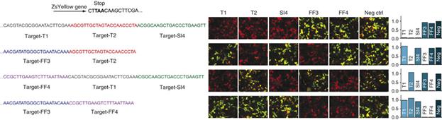 Multi-siRNA systems may exhibit undesired crosstalk between individual molecules. We measured this crosstalk, using ZsYellow derivatives with single targets cloned into their 3'-UTR and applying all siRNA molecules at the saturation concentration, one at a time, to each derivative. Crosstalk was negligible for this set of siRNAs (Supplementary Fig. 2 online), except for a possible minor ( 20%) reduction in the ZsYellow level when SI4 siRNA was applied to the FF4 target; this was further reduced to 10% when the FF4 target was a part of a clause molecule (Fig. 3). We then built and tested a number of mRNA clauses for DNF evaluators, fusing the siRNA targets into the 3'-UTR of the ZsYellow output (Fig. 3). The results show that complete downregulation is achieved separately by any of the cognate siRNAs but not by the others, as required by the construction (Fig. 3). Initially, one of the constructs (ZsYellow-T1-SI4-FF4) showed incomplete repression by two out of three siRNAs. We performed RNA-folding analysis of the clause sequence with permuted order of targets, and found that an arrangement selected for its low folding energy operates substantially better than the original (Supplementary Fig. 3 online).
