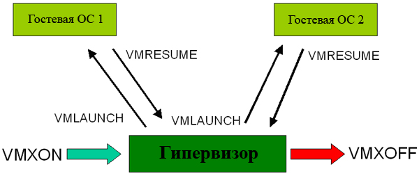Чтобы перевести процессор в режим виртуализации, платформа виртуализации должна вызвать инструкцию VMXON и передать управление гипервизору, который запускает виртуальную гостевую систему инструкцией VMLAUNCH и VMRESUME (точки входа в виртуальную машину). Virtual Machine Monitor может выйти из режима виртуализации процессора, вызвав инструкцию VMXOFF.