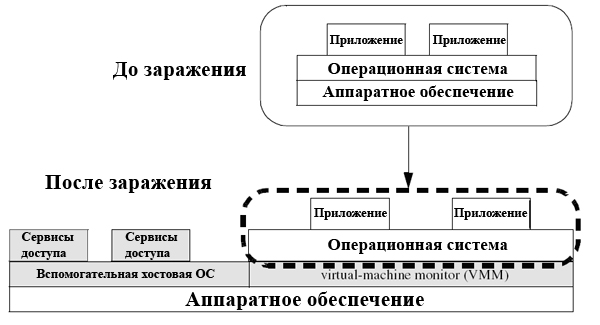 2. После этого, руткит начинает процедуру миграции физической платформы на виртуальную, по окончании которой происходит запуск виртуализованной платформы посредством гипервизора. При этом для пользователя ничего не меняется, все продолжает работать, как и раньше, а все средства и службы, необходимые для доступа к гипервизору извне (например, терминального доступа), находятся за пределами виртуализованной системы.