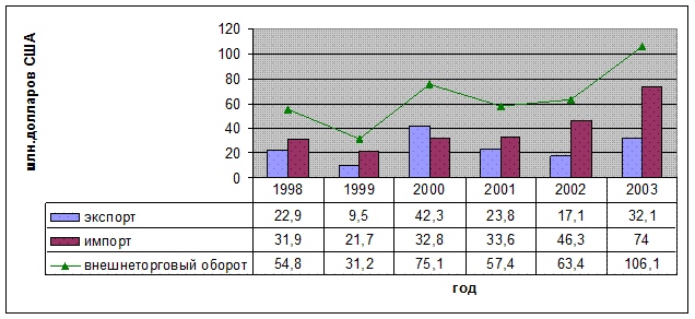 В новых условиях хозяйствования за период с 1992 по 2004 г. в динамике отмечались подъемы и снижения объемов внешнеторгового оборота (рис.1). Рост объемов внешней торговли России со странами СНГ с 1992 по 1997 гг. был обусловлен переходом на тарифные методы регулирования, постепенным снижением роли количественных ограничений и выходом на внешний рынок большого количества хозяйствующих субъектов всех форм собственности. Рост валютной стоимости экспорта и импорта в страны СНГ в 1992-1997 гг. происходил не в материально-вещественном, а в финансовом аспекте. Невысокие значения стоимости внешней торговли со странами СНГ не связаны с физическими объемами товарообмена и представляли собой следствие пересчета в доллары США с помощью валютного курса, который в то время был сильно завышен.