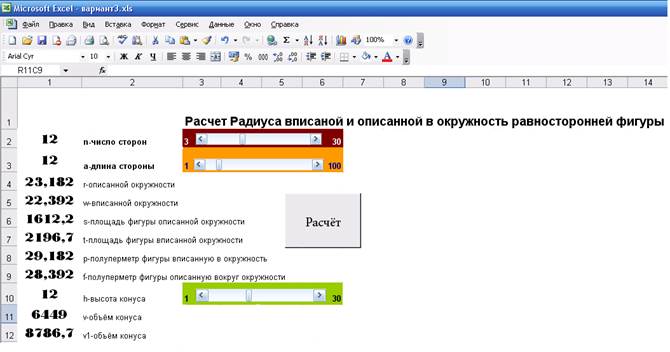 В начале программы с помощью полосы прокрутки мы вводим число сторон равностороннего многоугольника. В ячейке