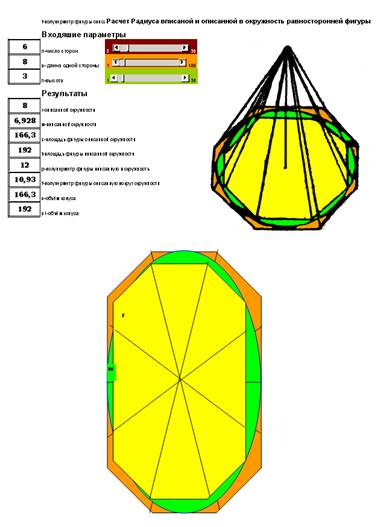 В данной работе была реализована программа по вычислению радиуса вписанной и описанной окружности, и нахождение площадей тех равносторонних фигур в которые они вписаны или описаны и нахождение объёмов N-угольных равносторонних пирамид.