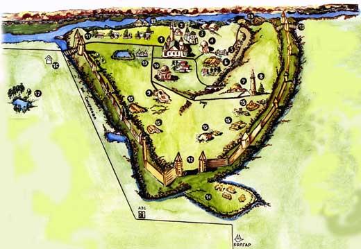 Теперь мы можем наблюдать только остатки древнего города Булгар - силуэты белокаменных руин. Они виднеются издалека на обрывистом левом берегу могучей реки Волги, в 30 км от впадения в неё реки Камы. Десять столетий тому назад нам открылась бы другая картина.