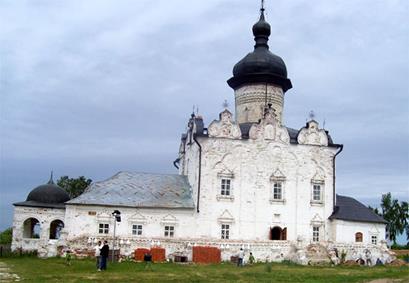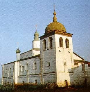 . Первоначально храм был деревянным. В начале XVII в. заменен каменным. Сложен из белого тесаного камня разной величины. Самая церковь помещалась во втором этаже двухэтажного храма. Нижний этаж служил складом для монастырского хозяйства, а еще раньше тут, по преданию, располагались кельи, и жили монахи. По внешности представляет собой образец архитектуры русских столпообразных храмов XVI - начала XVII вв. Сохранились остатки внешней фресковой росписи на западной стене, справа от портального входа в церковь: композиция ветхозаветной Троицы, изображения Сергия и Никона начала XVII в. Внутри храм тесен вследствие необыкновенной толщины стен. В нем три престола, каждый с особым приделом.