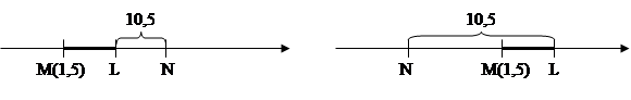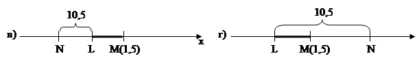 На рисунках представлены геометрические модели заданной ситуации: их четыре, т.е. задача имеет 4 решения: а) координата точки L: 1,5+10,5=12; координата точки N: 1,5+2*10,5=22,5; б) координата точки L: 1,5+10,5 : 3=5; координата точки N: 1,5-10,5 : 3 * 2=-5,5;