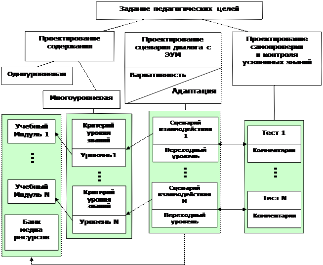 - программированного обучения – жёсткая последовательность предъявления порций знаний и пошагового контроля для индивидуализации усвоения, просто реализуемая на ЭВМ;