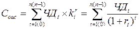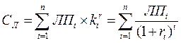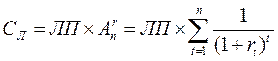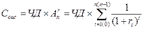 – настоящая стоимость аннуитета – множитель, который определяет настоящую стоимость серии равновеликих будущих единичных платежей за срок прогноза при начислении сложного процента;