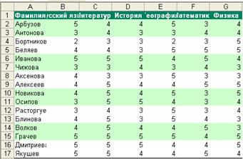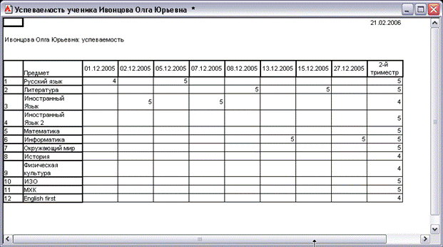 Для организации контроля за результатами обучения в программе предусмотрена возможность наглядного отображения и просмотра данных о текущей успеваемости выбранного учащегося по всем предметам. Для ее реализации дважды щелкните на имени учащегося в списке. На экране откроется выводная форма, содержащая сведения о текущей успеваемости по всем предметам (где выставлены оценки) и посещаемости данного ученика.