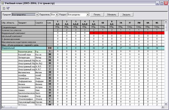 Верхние пять строк таблицы, предназначенные для ввода директивной информации, заполняются данными из поступающих в образовательные учреждения нормативных или нормативно-методических документов (например, из «Типового базисного учебного плана…» и т.п.). Эти данные поступают из вышестоящих органов управления образования, и учреждение не вправе в них что-нибудь менять (поэтому данная информация и названа нами «директивной»). Значения, задаваемые в строках директивной информации, служат для контроля и правильного оформления отчетной формы. Поэтому мы рекомендуем заполнить данные строки в начале работы по формированию учебного плана, чтобы в дальнейшем, при вводе конкретных нагрузок класса по конкретным предметам, иметь перед глазами те ориентиры, превышать которые, как минимум, не рекомендуется.