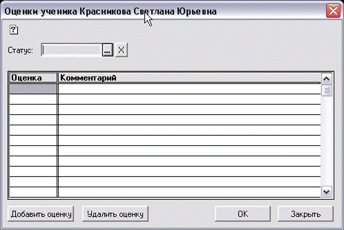 Для выставления оценок и указания отметок о посещении учащимся урока, дважды щелкните в клетке на пересечении строки учащегося с колонкой урока. На экране откроется диалог «Оценки учащегося».