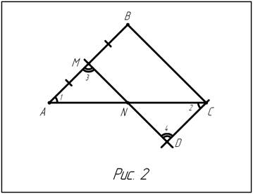 Через точку С проведем прямую, параллельную прямой АВ и обозначим буквой D точку пересечения этой прямой с прямой MN (рис. 2). Так как AM = МВ по условию, а MB = CD как противоположные стороны параллелограмма BCDM, то АМ = DC. Треугольники АМN и CDN равны по второму признаку равенства треугольников (АМ=CD,<1= <2 и <3=<4 как накрест лежащие углы при пересечении параллельных прямых АВ и CD секущими АС и МD), поэтому AN = NC.