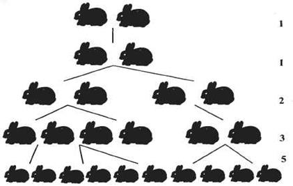 Основная задача поясняющая возникновение ряда чисел Фибоначчи – задача о кроликах. Вопрос задачи звучит так: «Сколько пар кроликов в один год рождается от одной пары?». К задаче дано пояснение, что пара кроликов через месяц рождает еще одну пару, а по природе кролики начинают рожать потомство на второй месяц после своего рождения. Автор дает нам решение задачи. Получается, что в первый месяц первая пара родит еще одну. Во второй первая пара родит еще одну – будет три пары. В 3-ий месяц родят две пары – изначально данная и рожденная в первый месяц. Получается 5 пар. И так далее, используя такую же логику в рассуждении мы получим, что в четвертый месяц будет 8 пар, в пятый 13, в шестой 21, в седьмлй 34, в в восьмой 55, в девятый 89, в дестый 144, в одиннадцатый 233, в двенадцатый 377.