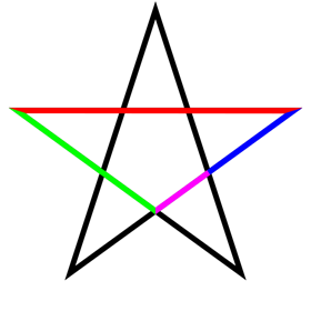 Вторая фигура – золотой треугольник. Это равнобедренный треугольник, в котором отношение боковых сторон к основанию равно . На его основе построены такие фигуры как пентаграмма и пятиконечная звезда.