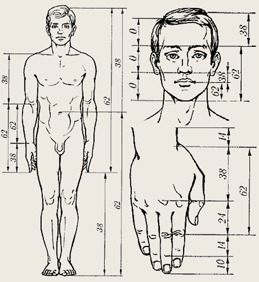 На самом деле строение нашего тела тоже можно рассмотреть относительно золотой пропорции. Любую часть нашего тела можно разделить также как и бесконечную прямую в начале этой главы.