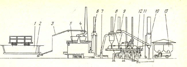 1 – приемный бункер; 2- питатель; 3- ленточный конвейер; 4- грохот; 5- топка; 6- сушилка; 7- мелющий