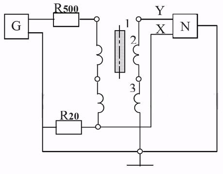 Первичные обмотки катушек включены последовательно, и по ним пропускается ток от генератора низкой частоты. Вторичные обмотки включены встречно, так что без образца напряжение на выходе днффе-