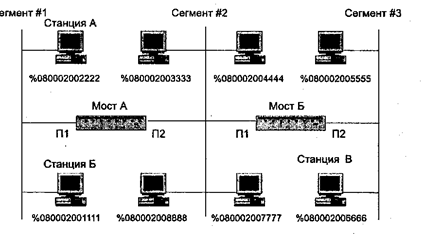 На рис. 3.1 показана сеть, состоящая из трех сегментов, связанных двумя коммутаторами. Знак % указывает на шестнадцатеричное представление физического (MAC) адреса. С началом работы коммутаторы А и Б проверяют весь трафик в каждом из подключенных сегментов. В процессе проверки трафика каждый коммутатор формирует свою базу данных адресов станций. Предположим, что станция А посылает кадр станции Б. Коммутатор А получает этот кадр на свой порт 1 (П1). Так как станции А и Б относятся к одному сегменту сети, коммутатор отбрасывает этот кадр (не реагирует на него). Если станция А посылает кадр станции В, находящейся в третьем сегменте сети, коммутатор А продвигает этот кадр во второй сегмент через свой порт 2 (П2). Коммутатор Б получит кадр на порт 1 и продвинет его через порт 2 в третий сегмент сети, где и расположена станция В. В таблице 3.1 показана сформированная коммутаторами база данных адресов.