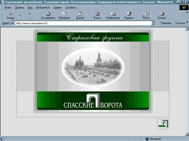 Дизайн сайта компании «Спасские ворота» хорошо продуман, выдержан в единой серо-зеленой цветовой гамме, создает впечатление серьезной, внушающей доверие компании. В этом плане сайт сильно отличается от многих других виртуальных интернет-офисов, изобилующих сложной графикой, крупными рисунками. Объективно сайт может показаться довольно мрачным, но с другой стороны на сайте в основном расположены небольшие рисунки, и их не очень много, т.к. графика захватывает значительную долю полосы пропускания линия связи, соединяющей посетителей вашего сайта с Интернетом. Если изображение слишком велико, то его загрузка может длиться нескончаемо долго, и вы рискуете потерять заказчиков, которые вынуждены томиться, ожидая загрузки изображения.