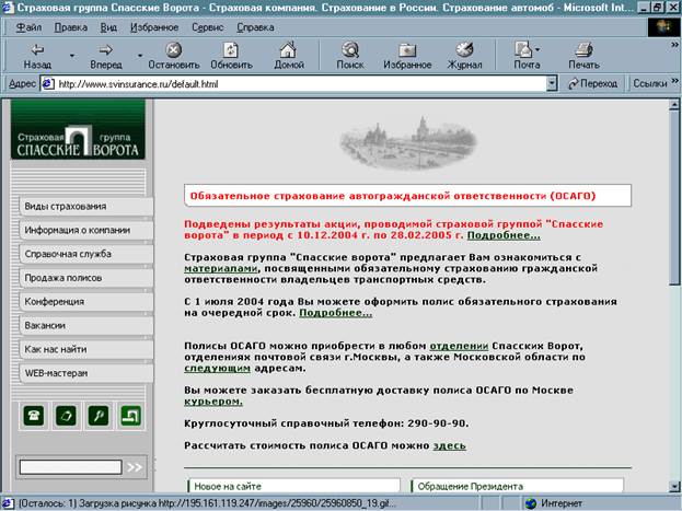 В настоящее время более 100 российских страховых компаний представлено в Интернет. При этом Web-сайты большинства страховых компаний выполняют лишь информационные функции, размещая на своих страницах в основном только общую информацию о компании и предлагаемых продуктах страхования, иногда описание своей деятельности.