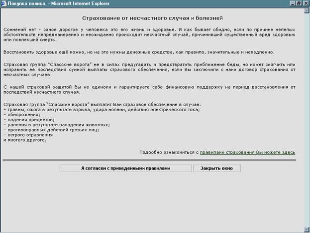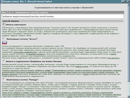 Основным разделом Web-сайта является "Виртуальный офис", в котором клиент может подробно ознакомиться со страховыми продуктами компании. Выбрав нужный вид страховки, клиент может узнать базовые программы этого вида страхования, технологию сервиса, условия предоставления скидок и пр. В данном разделе приведена также информация о самой компании, краткая история ее развития за 1997-1999 годы, список крупных клиентов. К сожалению, на сайте скудно представлена финансовая отчетность компании. Клиент может ознакомиться только с размером страховых премий, страховых выплат и резервов компании за 1997-1999 годы. Баланс компании представлен только сведениями об уставном капитале. После изучения данной информации клиент может перейти в раздел Web-сайта, который предназначен для совершения покупки страхового полиса.