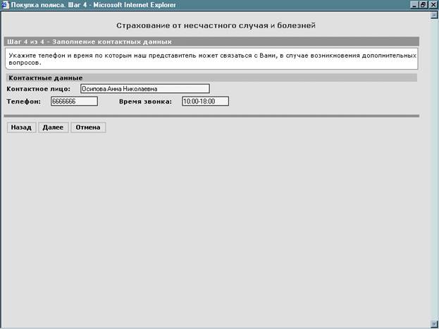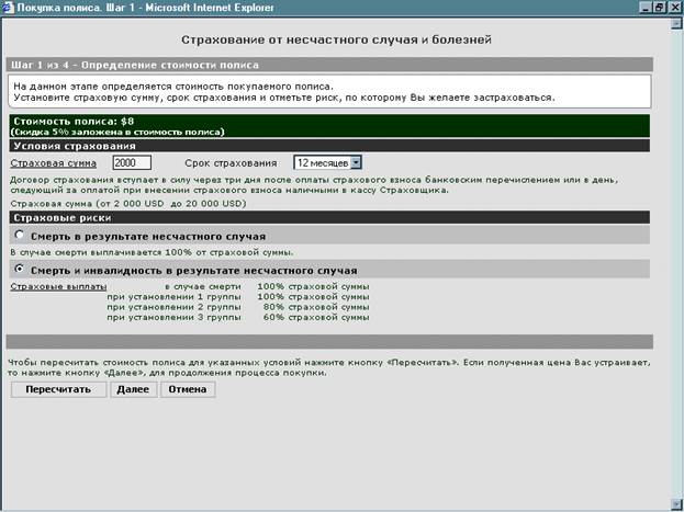 Клиент выбирает вид страхования и заполняет Web-форму для определения стоимости этого страхования. Если клиент согласен с суммой, тогда он переходит к следующему этапу.