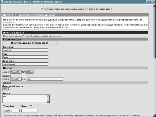 Нажимаем на кнопку «Далее». Появляется «бланк» заявления. Этот этап является самым сложным, долгим и вызывающим наибольшее количество вопросов у клиентов. У посетителя может не хватить терпения отвечать на все поставленные вопросы. Также может вызвать сомнения необходимость предоставления точных паспортных данных, адреса и телефона через Интернет. Оправданием является лишь тот факт, что виртуальное заявление представляет собой точную копию реального и, придя в офис клиент точно так же вынужден заполнять этот бланк. Поэтому к этому этапу необходимо подходить со всей ответственностью, поскольку неправильные или неточные сведения в заявлении могут послужить отказу в страховой выплате.