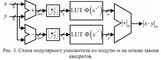 Умножители на основе закона квадратов (рис. 3) вычисляют модулярное произведение с помощью следующего равенства (закон квадратов):