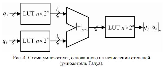 Степени i и i для q и q , соответственно, могут быть заранее вычислены и помещены в LUT. Сложение степеней выполняет сумматор по модулю m - 1. Обратное преобразование из степенного представления i и i в исходное q и q , также может быть выполнено с помощью предварительно вычисленных LUT.