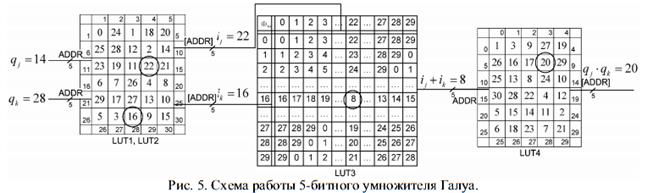 На рис. 5 показано, каким образом происходит умножение чисел 14 и 28 по модулю 31 по схеме, изображённой на рис. 4. Для простоты две таблицы LUT1 и LUT2 объединены в одну и представляют собой таблицы, переводящие умножаемые числа в степенное представление по табл. 1, а в качестве сумматора выступает простой модулярный сумматор, изображённый на рис. 2(а). LUT3 выполняет сложение по модулю 30, а LUT4 переводит результат из степенного представления обратно в первоначальный. LUT4 представляет собой табл. 1, только отсортированную по . На рис. 5 ADDR на входе таблицы и [ADDR] на выходе показывают, что значение, поступившее на вход таблицы, рассматривается в качестве линейного адреса элемента, который будет выдан на