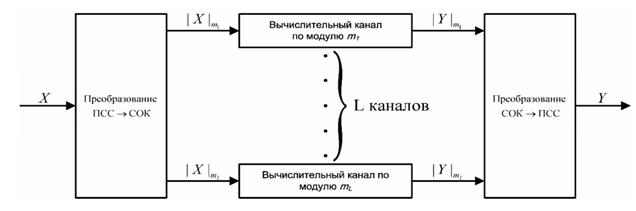 Как было отмечено выше (3), операции сложения и умножения в СОК осуществляются параллельно по L вычислительным каналам. Обобщенная структура устройств цифровой обработки сигналов в модулярной арифметике представлена на рис. 1. Число X на входе преобразовываются из позиционной системы счисления (ПСС) в модулярное представление в СОК в базисе модулей после чего выполняются независимые вычисления для каждого модуля mi