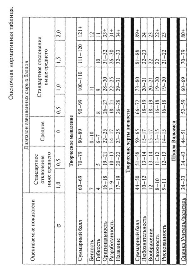 Все восемь факторов — дивергентного мышления (4) и личностных творческих характеристик (4) модели Вильямса включены в эту шкалу для оценки родителями и учителями. Для каждого фактора представлены 6 утверждений, для каждого утверждения дается выбор из 3 возможных типов поведения: «часто», «иногда» и «редко».
