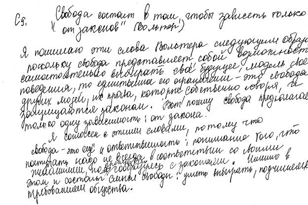 , а не области знаний в целом. В ответах же экзаменуемых достаточно часто встречается ошибка: высказывание становится лишь поводом к рассуждениям «на свободные темы». Так, например, один из экзаменуемых, выбрав высказывание «Законы должны для всех иметь одинаковый смысл», начал рассуждать о нестабильной политической ситуации в мире. Такой ответ можно оценить только в 0 баллов.