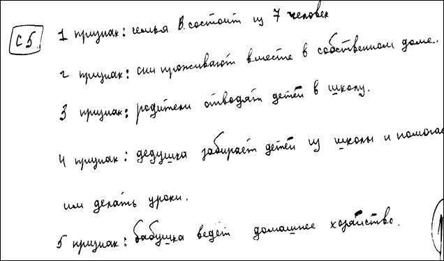 Семья В. состоит из 7 человек: родителей, троих детей, дедушки и бабушки Они проживают вместе в собственном доме. Родители работают и отводят детей в школу, дедушка забирает детей из школы и помогает им делать уроки, бабушка ведет домашнее хозяйство.