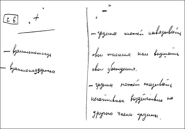 Автор текста утверждает, что главное «в малой группе – это сила, с которой группа действует на своего члена». С опорой на текст и личный социальный опыт укажите по два «плюса» и «минуса» такого воздействия.