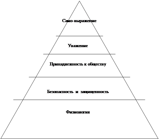 • Согласно теории Маслоу, выделяются пять основных типов потребностей (физиологические, безопасности, социальные, успеха, самовыражения) которые образуют иерархическую структуру, которая как доминанта, определяет поведение человека Потребности высших уровней не мотивируют человека, пока не удовлетворены, по крайней мере, частично, потребности нижнего уровня. Однако эта иерархическая структура не является абсолютно жесткой и строгой.