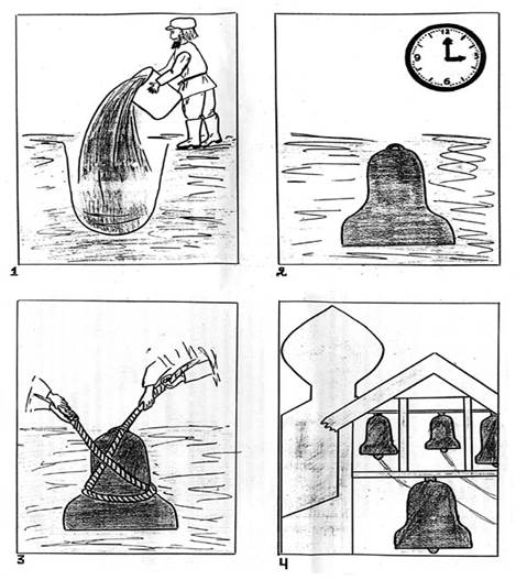 Перед детьми выставляется схема с четырьмя рисунками по отливке колокола.