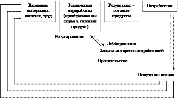 На схеме предусматривающей промышленную организацию как открытую систему (рис. 1), можно видеть поступление материалов, рабочей силы, капитала. Технологический процесс создается для переработки сырья в конечный продукт, который, в свою очередь, продается заказчику. Финансовые учреждения, рабочая сила, поставщики и заказчики, правительство – все являются частью окружения.