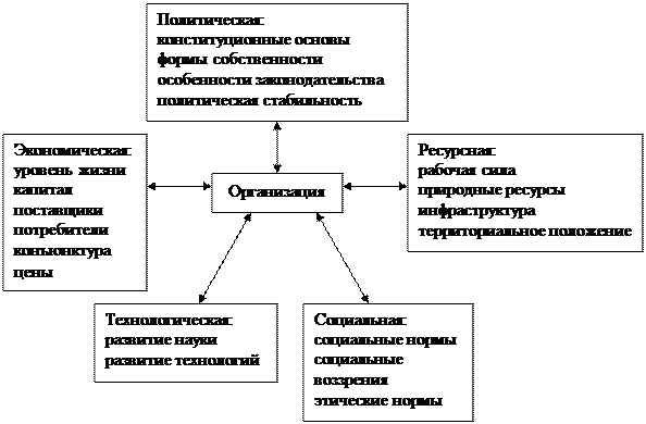 Одна из таких черт – это признание взаимозависимости между системой и внешним миром. Существует граница, отделяющая систему от ее окружения. Изменения в окружении влияют на один или несколько атрибутов системы, и наоборот, изменения в системе воздействуют на окружение. Внешняя среда организации схематично представлена на рис.2.