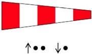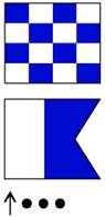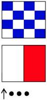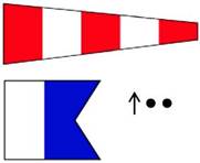 Значения зрительных и звуковых сигналов определены ниже. Стрелка вверх или вниз означает, что зрительный сигнал выставлен или убран. Точка (•) означает звук; пять коротких тире означают повторяющиеся звуки; длинное тире (—) означает продолжительный звук. Когда зрительный сигнал выставлен над флагом класса, сигнал относится только к этому классу.