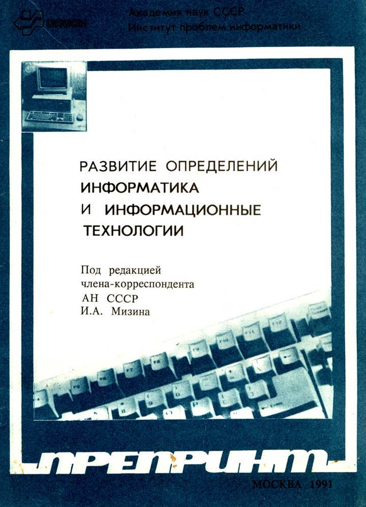 Развитие определений "информатика" и "информационные технологии" И.А.Мизин, И.Н.Синицын, Б.Г.Доступов, В.Н.Захаров, А.Н.Красавин. Под ред. И.А.Мизина - М.: ИПИ АН СССР. 1991. - 22 с.