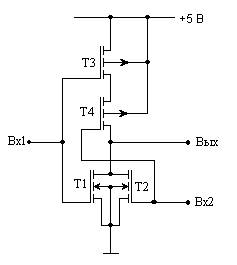 Пусть на вход Вх1 подается уровень логической единицы, тогда транзистор Т1 открывается, а ТЗ запирается. Тогда на выходе получается логический ноль, независимо от того, что было подано на вход Вх2.